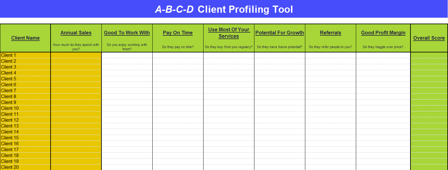 This tool will help rank your clients from best to worst. The ranking is based upon whether you enjoy working with them, number of repeat sales, if they pay on time, profit margin and do they refer more business to you. You will be able to see where they rank and how much they contribute to your overall sales.